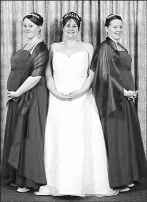 中國日報(bào)網(wǎng)環(huán)球在線消息:英國東蘇塞克斯37歲的離婚母親安吉拉·巴克和她的兩個(gè)女兒先后懷上了身孕,當(dāng)安吉拉和男友達(dá)倫舉行婚禮時(shí),她竟讓自己兩個(gè)懷孕的女兒為她充當(dāng)伴娘。所以當(dāng)參加婚禮的客人們看到新娘和兩個(gè)伴娘全都挺著大肚子時(shí),他們?nèi)俭@呆了。