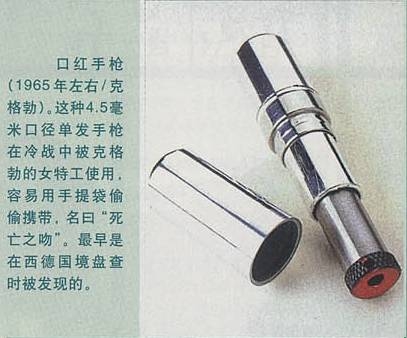 隱蔽武器的大量研制始于二戰(zhàn)。這種武器可以給間諜提供隱蔽打擊敵人的手段。有系在腰帶上或裝在袖子中的射擊武器、也可以偽裝成雪茄、煙斗或者雪茄。前蘇聯(lián)情報(bào)部1939年就研制成功專門用于暗殺的香煙盒型手槍,英國(guó)情報(bào)部門二戰(zhàn)時(shí)還使用過(guò)“線軸”型手槍和煙斗手槍。二戰(zhàn)后,情報(bào)機(jī)構(gòu)繼續(xù)研制這種武器,最值得注意的是KGB配備的4.5毫米口徑射擊武器,它容易藏在許多地方包括口紅的筒桿中,一旦身份暴露就出其不意地致人于死地,然后迅速逃離現(xiàn)場(chǎng)。前KGB的唇膏手槍外形酷似一支唇膏,其實(shí)卻是一支用于近距離射擊的單發(fā)手槍,所以稱之為“死亡之吻”。