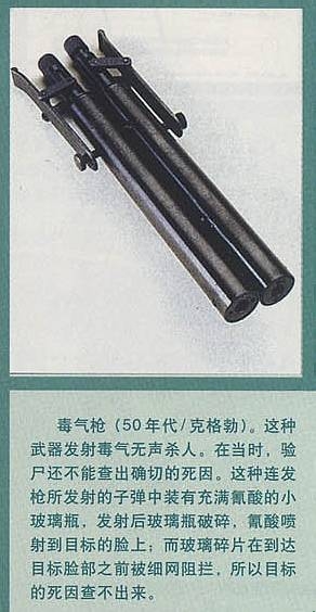 暗殺武器是情報(bào)機(jī)構(gòu)研制的重點(diǎn)之一。有時(shí)候間諜會(huì)奉命暗殺被本國(guó)政府認(rèn)為危害國(guó)家利益的人。多數(shù)情況下,行刺者執(zhí)行暗殺任務(wù)時(shí)需要低調(diào)行事,避免因此而受到追查。但也有一些暗殺是以示警告,可能會(huì)干得顯眼一些,前蘇聯(lián)克格勃(KGB)在過(guò)去的許多暗殺活動(dòng)中,發(fā)明和使用了各式各樣的暗殺方法,甚至建立了毒氣實(shí)驗(yàn)室。KGB研制的暗殺武器,不但殺人于無(wú)聲而且解剖尸體也無(wú)法查出死亡原因,例如可以噴射毒氣或發(fā)射毒彈暗殺某人。這些武器可以偽裝成手杖、雨傘或者藏在報(bào)紙里,可謂殺人不見(jiàn)血。1978年,保加利亞作家馬爾科夫在倫敦街頭被毒雨傘刺了一下,結(jié)果4天后因中毒而死。