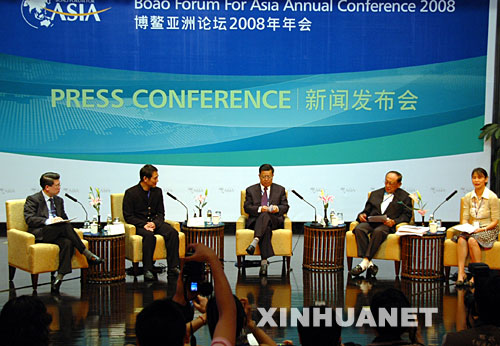4月11日,博鰲亞洲論壇秘書(shū)長(zhǎng)龍永圖(左三)、博鰲亞洲論壇理事長(zhǎng)拉莫斯(左四)和中國(guó)紅十字會(huì)博愛(ài)大使、本屆年會(huì)特殊嘉賓李連杰(左二)出席新聞發(fā)布會(huì)。當(dāng)日,博鰲亞洲論壇2008年年會(huì)舉行新聞發(fā)布會(huì)。博鰲亞洲論壇2008年年會(huì)各項(xiàng)籌備工作已經(jīng)就緒,超過(guò)1700名來(lái)自亞洲和世界其他地區(qū)的政府官員、企業(yè)代表、專家學(xué)者、媒體記者等將參加本次年會(huì)。新華社記者 魚(yú)瀾 攝
