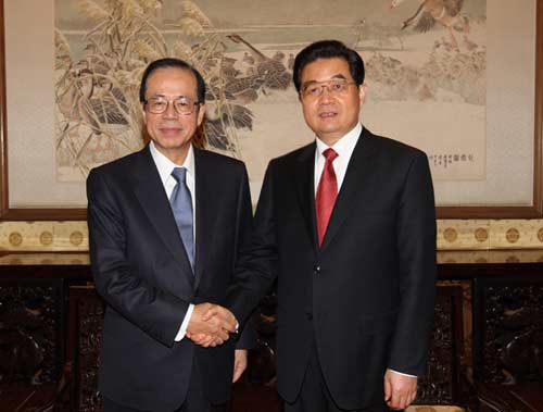 資料圖片:2007年12月28日,國家主席胡錦濤在北京釣魚臺(tái)養(yǎng)源齋會(huì)見日本首相福田康夫。新華社發(fā)(吳華 攝)