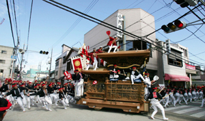2007年9月16日,在日本大阪府的岸和田市,人們拉著花車在街道上穿行?;ㄜ嚰朗谴筅娓浇豁?xiàng)民間活動(dòng),成百上千的人們抬著數(shù)噸重的花車奮勇前行、穿越街道。這一活動(dòng)在當(dāng)?shù)赜?00余年的歷史了?!⌒氯A社/法新