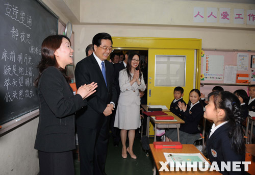 走進三樓一間教室,胡錦濤旁聽了三年級的一堂中文課。黑板上書寫著用“以前”、“以后”造句的示范和《靜夜思》的詩句。女教師張延華讓全體同學一起朗誦《靜夜思》。隨后,孩子們又為胡爺爺背誦了孟浩然的《春曉》。聽著這些在海外成長的孩子們用稚嫩童音朗誦“床前明月光”、“春眠不覺曉”這些中國歷史上千年傳誦的佳句,胡錦濤頷首微笑。