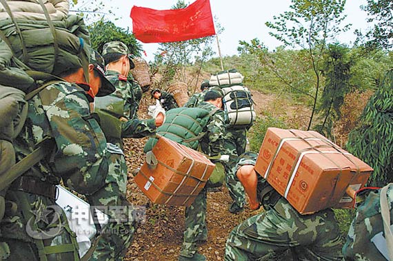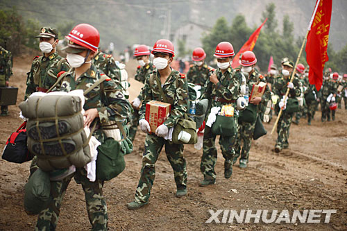 5月26日,武警水電部隊(duì)組織431名突擊隊(duì)員,身背雷管炸藥,徒步翻山越嶺,奔赴唐家山堰塞湖執(zhí)行搶險(xiǎn)任務(wù)。記者岱天榮攝