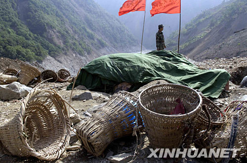 5月27日,一名武警戰(zhàn)士守衛(wèi)堆放在北川唐家山堰塞湖堰塞體上的工程炸藥。這些炸藥都是戰(zhàn)士們用背簍徒步背到搶險(xiǎn)現(xiàn)場(chǎng)的。新華社記者黎大東 攝