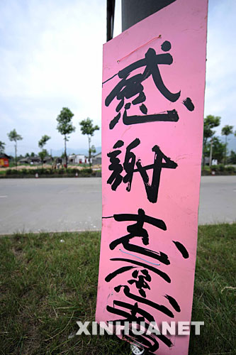 5月19日,一塊寫(xiě)有“感謝志愿者”的木牌被豎在路中央的隔離帶上。綿竹地震災(zāi)區(qū)部分受災(zāi)群眾自發(fā)在路邊豎起“感謝牌”,表達(dá)對(duì)各界援救的感激。新華社記者王建華攝