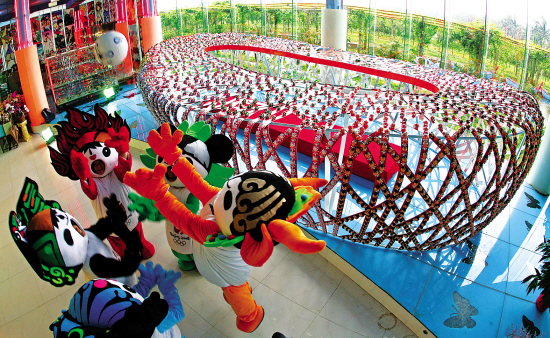 這座微縮版“鳥(niǎo)巢”是由無(wú)數(shù)機(jī)器貓、kitty貓、蠟筆小新、米老鼠等公仔巧妙組合而成??蓯?ài)的動(dòng)漫人物讓孩子們跑前跑后,看遍體育場(chǎng)的每一個(gè)角落。