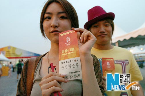 兩名觀眾正在向記者展示他們的彩排門票。新華網(wǎng) 陳競超 攝