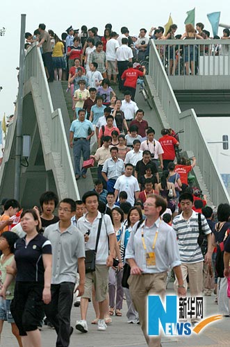 中國日報(bào)網(wǎng)站環(huán)球在線消息:北京奧運(yùn)開幕式第一次帶妝彩排7月30日晚在鳥巢舉行。記者18時(shí)走出主新聞中心,通往鳥巢方向的道路上,行人明顯增多,安保力量也明顯加強(qiáng)。國家體育場前的廣場上,大批的志愿者熱情有序地引導(dǎo)著從四面八方匯聚來的人流。