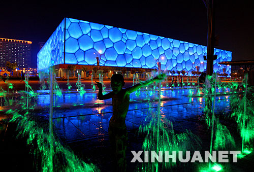 8月3日晚,一名小男孩在位于“鳥(niǎo)巢”和“水立方”之間的音樂(lè)噴泉間玩耍。夏夜的“鳥(niǎo)巢”和“水立方”在變幻多彩的音樂(lè)噴泉的點(diǎn)綴下分外迷人。新華社記者呂明響攝