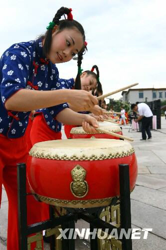 8月1日,山西的鼓樂團演員在天安門廣場表演鼓樂。奧運期間,北京市文化局將在天安門廣場舉辦一系列形式多樣的文化藝術活動?;顒訉⑼怀觥白8W運”“歡慶奧運”“和諧奧運”“民俗奧運”等7大主題,內容包括外省市樂團、國際大中學生樂團節(jié)目展演,群眾文藝比賽、聯(lián)歡及非物質文化展演等。新華社記者 高學余 攝