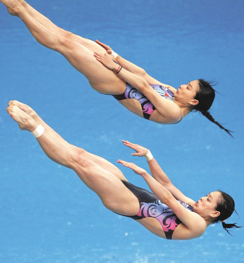 中國(guó)的郭晶晶(上)、吳敏霞組合在女子3米跳板雙人項(xiàng)目比賽中表現(xiàn)近乎完美,金牌當(dāng)仁不讓。(圖片來源:《朝鮮日?qǐng)?bào)》)