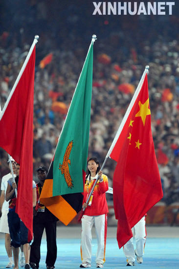 2008年8月24日,2008年北京奧運會在國家體育場——“鳥巢”隆重閉幕。這是閉幕式上中國羽毛球名將張寧手舉五星紅旗入場。新華社記者王雷攝