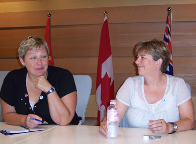 溫哥華奧組委殘奧會總監(jiān)蒂娜?考沃德(右)和溫哥華奧組委社區(qū)關系總監(jiān)莫林?道格拉斯接受記者采訪。(中國日報網(wǎng)圖片)