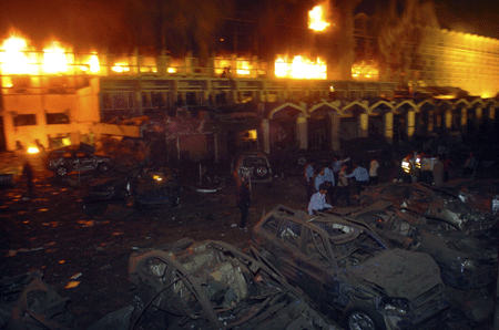 據(jù)英國媒體報(bào)道,據(jù)警方初步調(diào)查,一輛滿載炸藥的卡車20日晚8點(diǎn)左右(北京時(shí)間晚上10點(diǎn)左右)在沖向萬豪酒店門口后爆炸。由于爆炸威力巨大,地面被炸出一個(gè)9米多的大坑,包括大堂在內(nèi)的酒店主體建筑被毀,酒店大部分建筑起火,酒店附近的幾座建筑物也不同程度受損,數(shù)十輛汽車也被炸毀。巴內(nèi)政部稱此次爆炸中使用了500多公斤炸藥。