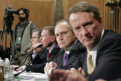 美國(guó)汽車(chē)業(yè)“三巨頭”通用、克萊斯勒和福特的首席執(zhí)行官(由右至左)出席國(guó)會(huì)聽(tīng)證會(huì)。