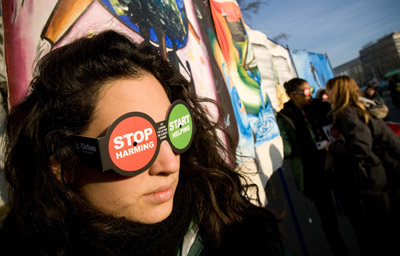 網(wǎng)友評論 條 2008-12-05 09:00:22 中國日報網(wǎng)環(huán)球在線消息:12月4日,在波蘭歷史名城波茲南,一些環(huán)保人士在聯(lián)合國氣候變化大會會場外舉行集會,呼吁發(fā)達國家減少溫室氣體排放并幫助貧窮國家減輕氣候變化造成的危害。他們佩戴的特制眼睛上寫有“停止危害,開始幫助”字樣。當天,聯(lián)合國氣候變化大會繼續(xù)在波茲南舉行。