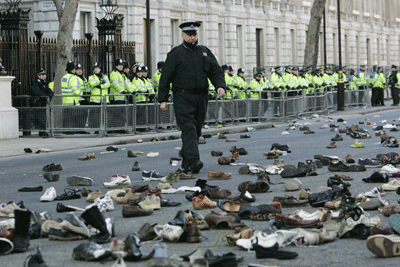 英國首相府邸前到處都是示威者擲過來的鞋子