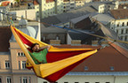 當?shù)貢r間2014年1月報道,睡吊床可是一件十分愜意休閑的事情,不過這個距離地面100英尺的高空吊床卻只能用毛骨悚然來形容!冒險家Igor Scotland在奧地利維也納離地100英尺的空中拉起鋼絲繩掛起一張吊床,并在吊床中休息和睡覺,向自己的膽量極限發(fā)起挑戰(zhàn),吸引了大批市民駐足觀看,不少圍觀者都為他捏把汗。不過斯科蘭特本人卻悠然自得,不僅靜靜享受腳下的維也納風光,還不時在鋼絲繩上表演高超的技藝。據(jù)悉,這些驚人的畫面則是由奧地利攝影師Sebastian Wahlhuetter所拍攝的。