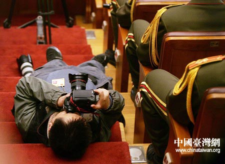 兩會花絮:攝影記者躺在地上尋求拍攝角度