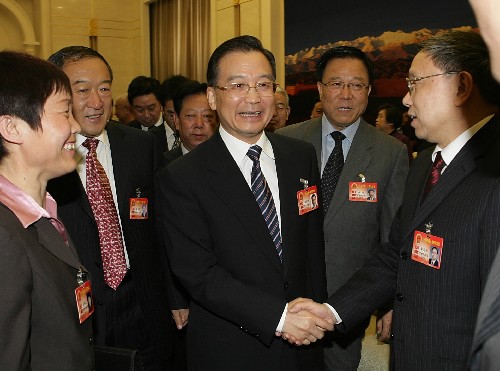 3月6日,中共中央政治局常委、國務(wù)院總理溫家寶參加十屆全國人大四次會議甘肅代表團審議,聽取代表們的意見。 新華社記者李學(xué)仁攝