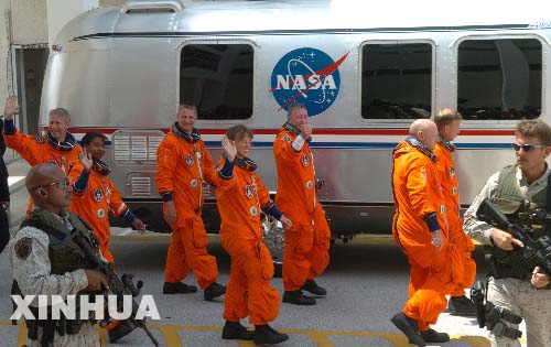 7月1日,在美國佛羅里達(dá)州卡納維拉爾角的肯尼迪航天中心,“發(fā)現(xiàn)”號航天飛機(jī)的7名宇航員。新華社記者趙鵬攝