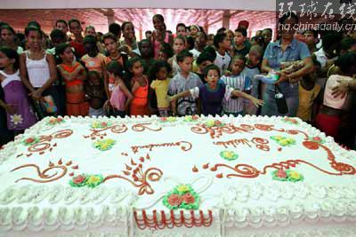8月13日,一群孩子聚在一個為卡斯特羅80大壽制作的大蛋糕前,蛋糕上寫著“祝總司令生日快樂。”(路透社圖片)