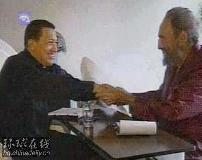 古巴國(guó)家電視臺(tái)8月14日首次播放了卡斯特羅的視頻錄像。當(dāng)時(shí),在為時(shí)10分鐘的電視畫(huà)面中,臥床的卡斯特羅與來(lái)訪的查韋斯談笑風(fēng)生。