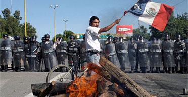 身著防暴衣,手持防暴盾牌和沖鋒槍的警察在高壓水槍和直升飛機(jī)的伴隨下,從瓦哈卡的郊區(qū)向該市的中心廣場(chǎng)推進(jìn)。中心廣場(chǎng)已經(jīng)被左翼分子占領(lǐng)了數(shù)個(gè)月。當(dāng)警察組成的人墻向前推進(jìn)的時(shí)候,數(shù)百名抗議者憤怒地大聲吼叫,有時(shí)還能將人墻往后推后幾步。家庭主婦、工人、學(xué)生、老師和其他一些人在他們被警察推后時(shí),大聲呼喊到,“大家團(tuán)結(jié)起來(lái),就會(huì)戰(zhàn)無(wú)不勝。”