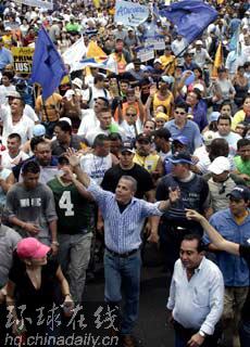 就在查韋斯威脅停止向美國出口石油的當(dāng)天,反對(duì)黨總統(tǒng)候選人羅薩雷斯的上萬名支持者在首都加拉加斯舉行示威游行,隊(duì)伍長達(dá)25公里。警方部署了1000多名警察,以防止羅薩雷斯的支持者與查韋斯支持者爆發(fā)沖突。