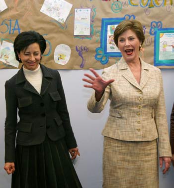 或許是布什一路遭到了太多抗議和示威,身為美國(guó)第一夫人的勞拉很想幫丈夫挽回一點(diǎn)面子,于是打起了“溫情牌”。