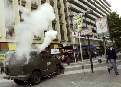 據(jù)當(dāng)?shù)孛襟w報(bào)道,抗議者阻斷了圣地亞哥市的各個交通要道,他們設(shè)置路障,并點(diǎn)火燃燒,部分地區(qū)甚至還聽到了零星的槍聲。沒過多久,抗議活動就演變成了一場騷亂。為了驅(qū)散人群,被派往現(xiàn)場的警察使用了催淚彈和水槍,而學(xué)生們則用石塊還擊。