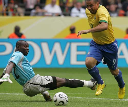 ——巴西對(duì)加納地比賽開場(chǎng)第5分鐘,卡卡中場(chǎng)高速帶球直傳,羅納爾多反越位成功,與加納門將金斯頓形成1v1的形式,用他標(biāo)志性的剪刀腳過掉了出擊的金斯頓,打空門球進(jìn)。這粒進(jìn)球,是羅納爾多在世界杯決賽階段的第15個(gè)進(jìn)球,他成功的超越了蓋德-穆勒的14球的紀(jì)錄,成為迄今為止世界杯上的第一射手。從進(jìn)球后的表情來看,羅納爾多非常平靜,他如往常一樣伸出了手指,并露出了笑容。羅納爾多賽后說,這個(gè)進(jìn)球在自己的預(yù)料之中,無論對(duì)手是誰,他所想的都只有一件事情-那就是怎么攻破他們的球門。(沃斯)