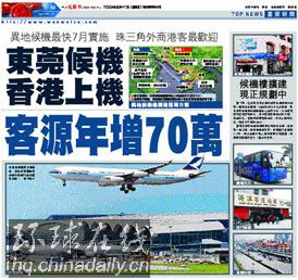 環(huán)球在線消息:香港《文匯報》5月12日頭條消息:異地候機最快7月實施 珠三角外商港客最歡迎 東莞候機香港上機 客源年增70萬。