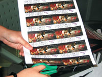 記者隨后來到影院辦公室,正好遇見工作人員正把一疊印好的《夜宴》電影票裁成單獨(dú)的一張張!兑寡纭伏c(diǎn)映的電影票印有彩色的《夜宴》劇照,顯得很別致。影院的黃小姐介紹說,這些票是不對(duì)外出售的,只發(fā)給片方邀請(qǐng)來的媒體和嘉賓,但媒體和嘉賓都要憑本人身份證才能領(lǐng)取。