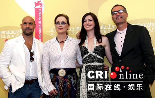 環(huán)球在線消息:9月7日第63屆威尼斯電影節(jié),(右起)導(dǎo)演大衛(wèi)· 弗蘭科(David Frankel)、演員安妮·海瑟薇(Anne Hathaway)、57歲的梅麗爾·斯特里普(Meryl Streep)和斯坦利·塔奇(Stanley Tucci)在他們拍攝的電影《時(shí)尚女魔頭》(The Devil wears Prada)的首映禮上。