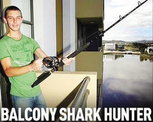 羅比·休斯住在澳大利亞昆士蘭州黃金海岸附近的一幢公寓樓的6樓,他的公寓樓下面就是一個以運河和大海相通的人工湖——奧爾湖。一天,休斯驚奇地發(fā)現(xiàn),他家陽臺下的人工湖里竟然游來了一大群鯊魚,他于是決定在6樓陽臺上甩下釣竿,站在家里釣鯊魚。