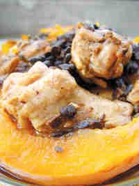 {3}把腌好的雞翅根連同腌汁一起倒入南瓜中。蒸鍋開(kāi)鍋后,放入鍋中用大火蒸30分鐘即可。