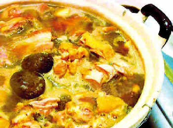 3、炒鍋內(nèi)倒入50克豬油,燒至六成熱,下冬筍片炒幾下,再下肉片、肚片、墨魚片、香菇、醬油、鹽,炒熟,倒入火鍋內(nèi)。