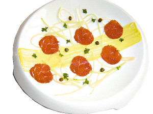 這道開胃菜充滿意大利特色,生牛肉切成薄薄的圓片,不加任何調(diào)料。青瓜和哈密瓜則切成絲,青綠的色彩很活潑。底下鵝黃色的是法國弟戎芥末醬。上面黑色的小圓粒是水瓜柳,一種花,在花蕊里加上醋腌制而成。它是地中海特有的食材,據(jù)說是越小越好。