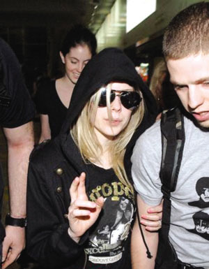 型女艾薇·拉維尼前晚約8時(shí)走出香港機(jī)場(chǎng),身穿有帽衛(wèi)衣和一身全黑便服,戴著墨鏡,貫徹?fù)u滾冷酷的外形,身旁有5名保鏢貼身護(hù)駕,隨行工作人員多達(dá)約30人,盡展天后風(fēng)范。