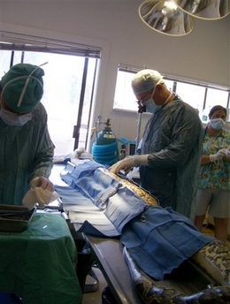 環(huán)球在線消息:日前,美國愛達荷州的獸醫(yī)實施了一次不尋常的手術,他們給一條4米長、27公斤重的巨蟒開膛破肚,從它體內取出了一張電熱毯。