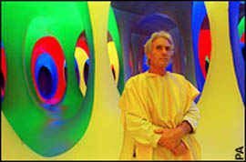 “夢想空間”占地約50平方米,每個充氣室高約5米,由五顏六色的半透明的聚乙烯塑料制成,內(nèi)部充氣,穿上彩色衣服的參觀者在里面行走,也成為這件作品的一部分。