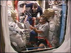 宇航員們在密封艙內(nèi)為太空行走作準(zhǔn)備