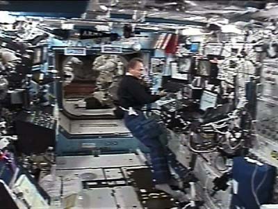 加拿大宇航員史蒂文·麥克萊恩在太空艙內(nèi)工作
