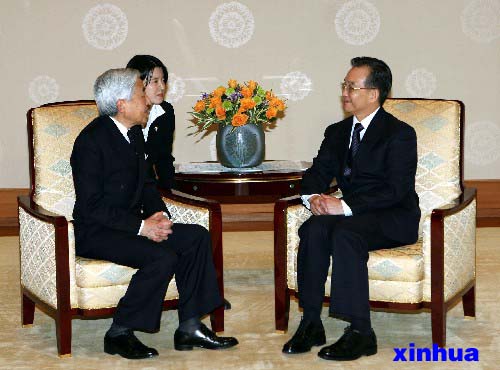 中國日報網環(huán)球在線消息:日本明仁天皇12日在皇宮會見了正在日本進行正式訪問的國務院總理溫家寶。