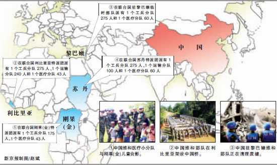 目前,中國(guó)共有10支維和部隊(duì)1546人在4個(gè)聯(lián)合國(guó)任務(wù)區(qū)執(zhí)行維和任務(wù)。其中,在聯(lián)合國(guó)剛果(金)特派團(tuán)派有218人;在聯(lián)合國(guó)利比里亞特派團(tuán)派有558人;在聯(lián)合國(guó)駐黎巴嫩臨時(shí)部隊(duì)派有335人;在聯(lián)合國(guó)蘇丹特派團(tuán)派有435人。