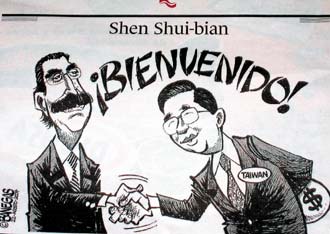 陳水扁提出多項(xiàng)經(jīng)濟(jì)援助,不過洪都拉斯早報《新聞報》刊登一幅漫畫,陳水扁哈腰背著一大袋美金,和抬著下巴的洪國總統(tǒng)賽拉亞握手,上方字樣是“陳水扁,歡迎”。(臺灣《聯(lián)合報》圖片)