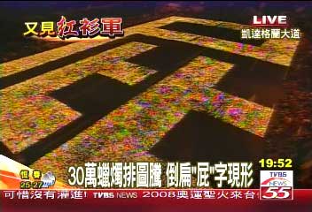 隨著天色漸暗,紅衫軍人潮聚集越來(lái)越多之時(shí),大約6點(diǎn)左右,這個(gè)以30萬(wàn)只紅色蠟燭排成的神秘圖騰終于揭曉,原來(lái)是一個(gè)“屁”字!而今夜倒扁口號(hào),也從“阿扁下臺(tái)”變成“阿扁放屁”,來(lái)諷刺阿扁的言行,都是假話(huà)。