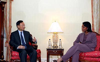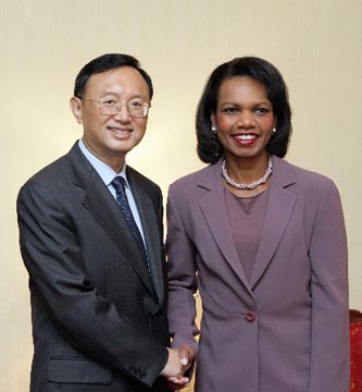外交部長楊潔篪在美國紐約華爾道夫飯店會見美國國務卿賴斯。新華社記者侯俊攝